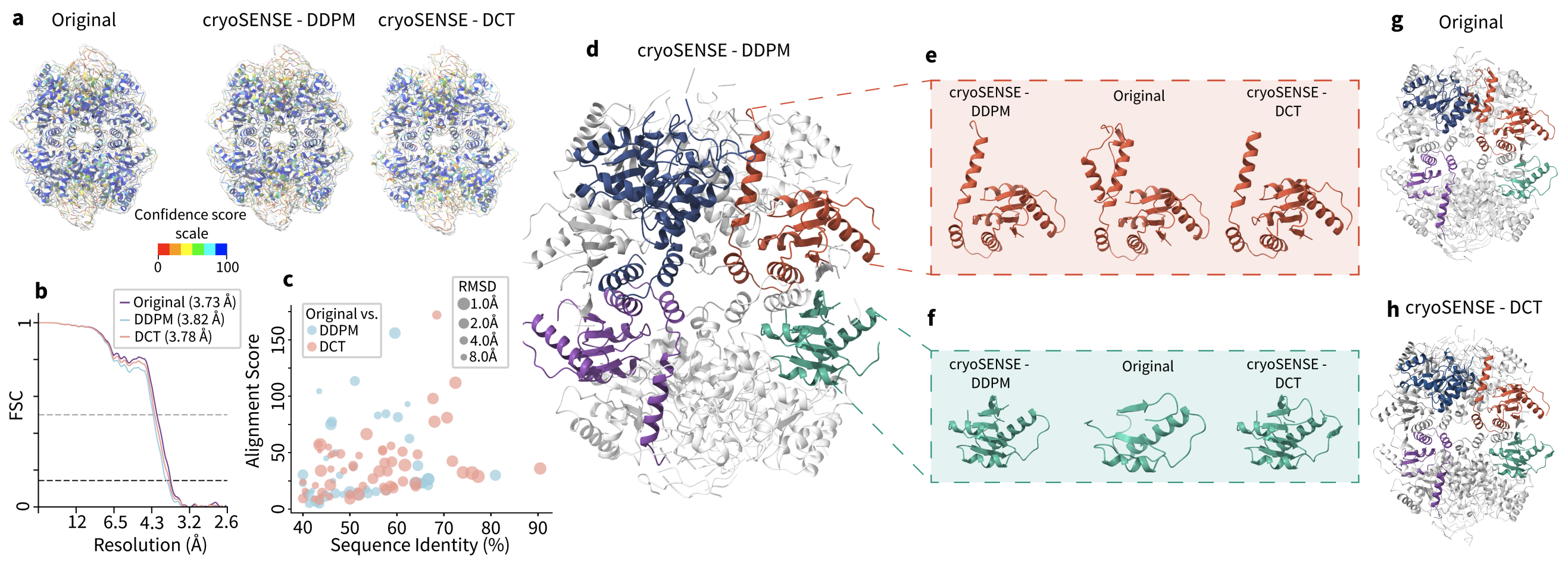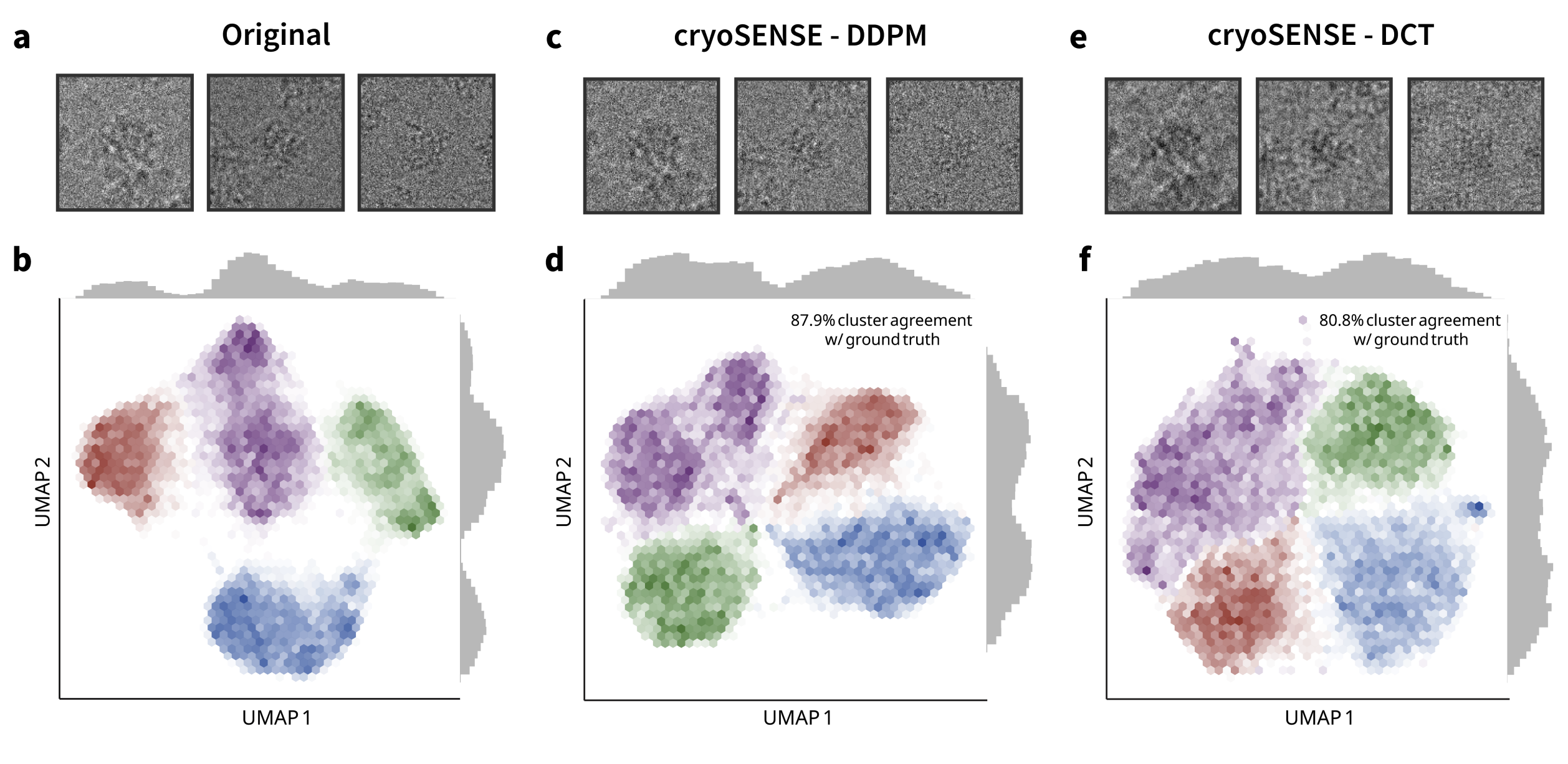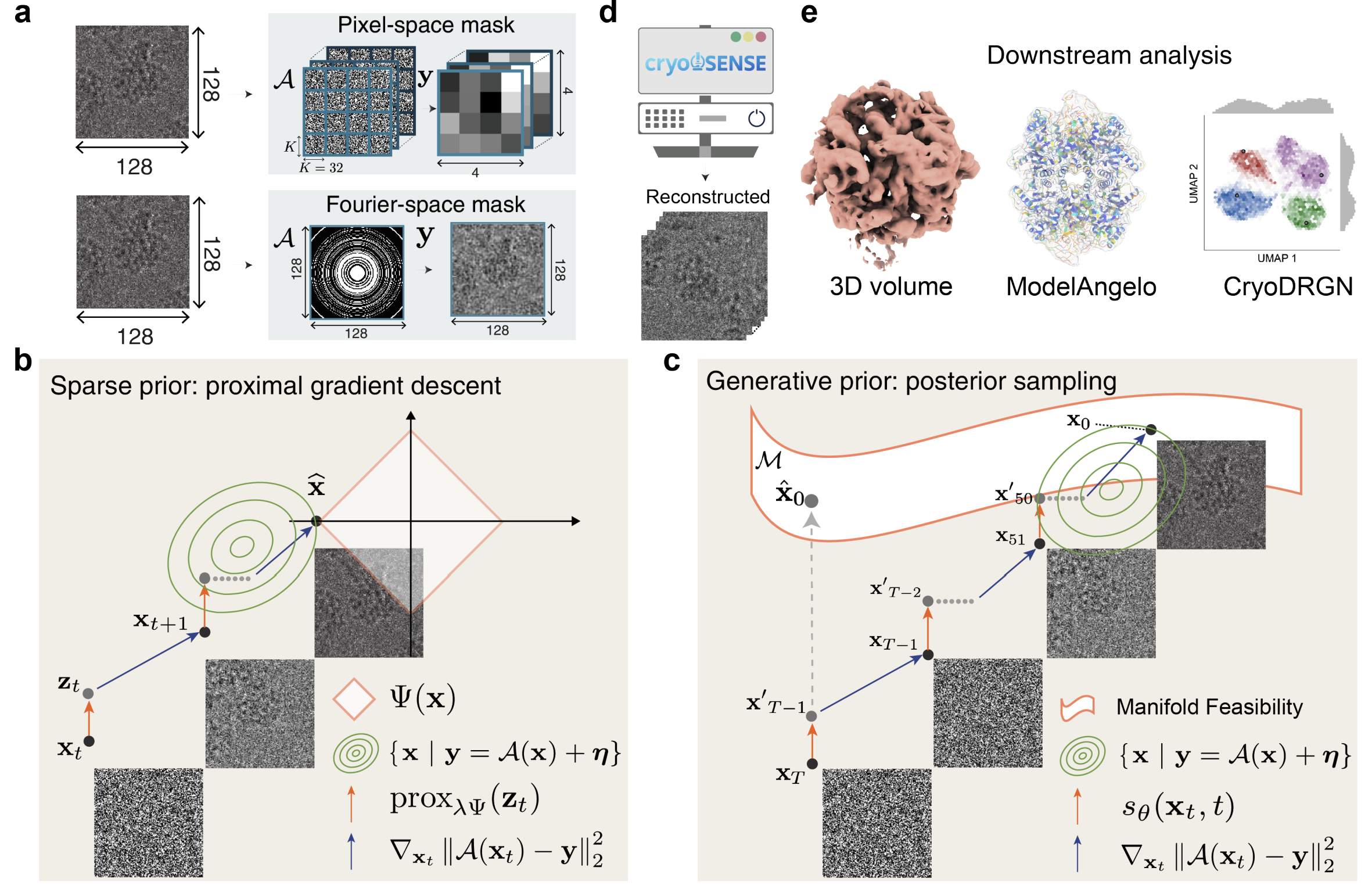 We show that cryo-EM images of proteins lie on low-dimensional manifolds that can be independently represented using sparse priors in predefined bases and generative priors captured by a denoising diffusion model. cryoSENSE leverages these low-dimensional manifolds to enable faithful image reconstruction from spatial and Fourier-domain undersampled measurements while preserving downstream structural resolution. In experiments, cryoSENSE increases acquisition throughput by up to 2.5× while retaining the original 3D resolution, offering controllable trade-offs between the number of masked measurements and the level of downsampling.
